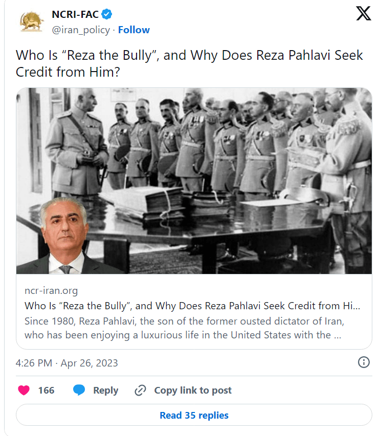 - Manipulation av sociala medier – ”Pahlavi-anhängare använder den enorma rikedom som smugglades ut ur Iran av shahen. De driver många sociala mediekonton. Dessa konton driver repetitivt deras agenda.”