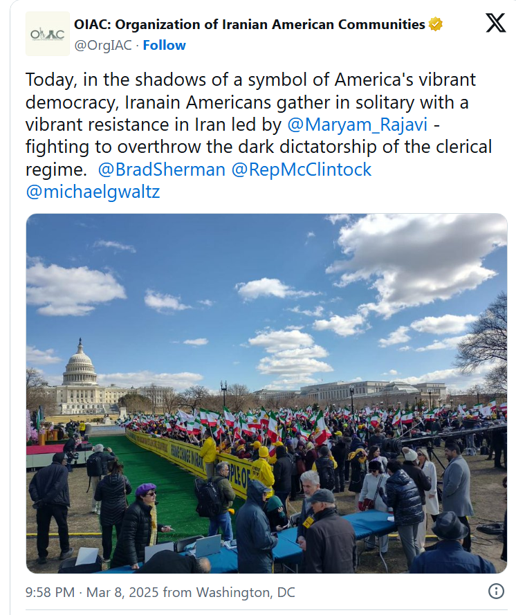 WASHINGTON, D.C. – Lördagen den 8 mars 2025 samlades tusentals iransk-amerikaner och sympatisörer av den iranska nationella motståndsrådet (NCRI) i Washington för att fira Internationella kvinnodagen och visa solidaritet med det iranska motståndet mot prästerskapets diktatur.