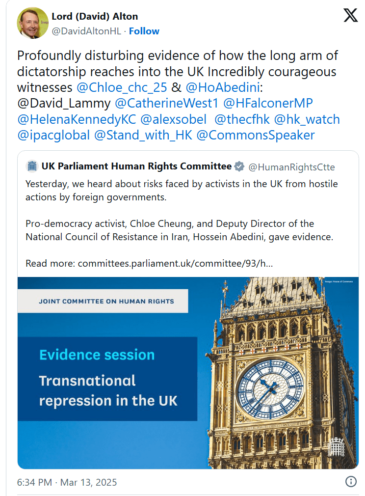 Det brittiska parlamentets gemensamma kommitté för mänskliga rättigheter har släppt en inspelning av sin senaste bevissession om transnationellt förtryck, som belyser de eskalerande hot som aktivister bosatta i Storbritannien står inför. Sessionen, som hölls den 11 mars, innehöll vittnesmål från demokratiaktivisten Chloe Cheung och Hossein Abedini, biträdande chef för National Council of Resistance of Iran (NCRI), tillsammans med juridiska experter som specialiserat sig på missbruk av Interpol.