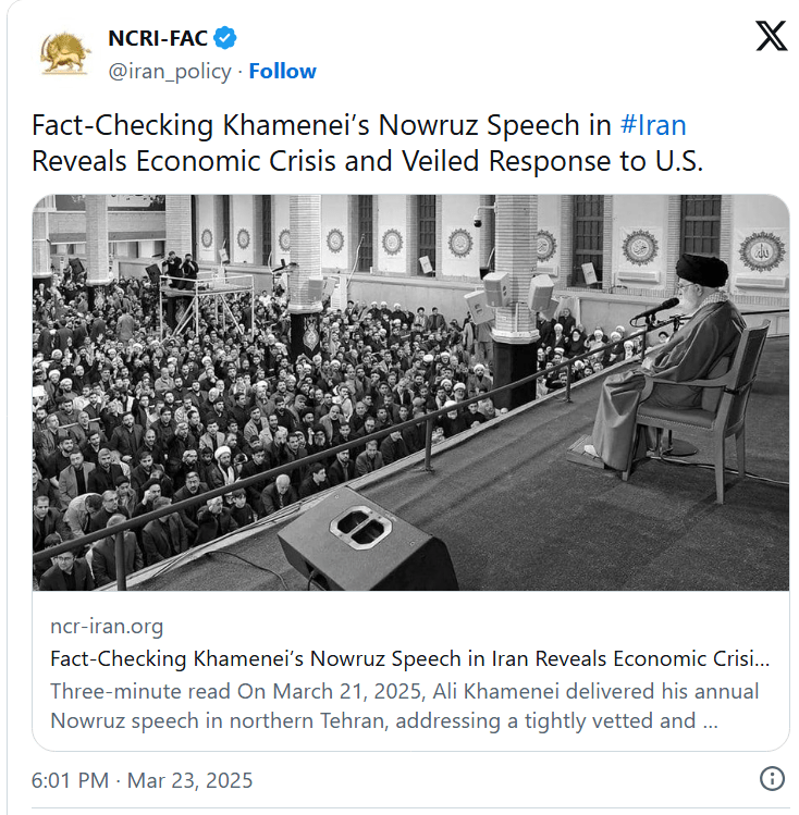 Iranska regimens högste ledare Ali Khamenei höll ett tal den 31 mars 2025 under Eid al-Fitr-bönen i Teheran och signalerade än en gång att hans främsta oro inte ligger i utländska hot utan i internt uppror.